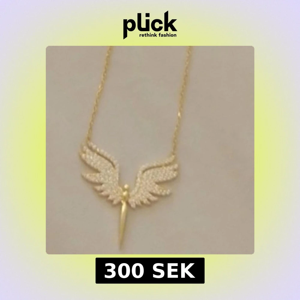 Unikt halsband i guld med ett hängsmycke som föreställer änglavingar och en stiliserad figur. Vingarna är dekorerade med små glittriga detaljer som ger extra shine. Perfekt för dig som gillar statement-smycken med cool design.