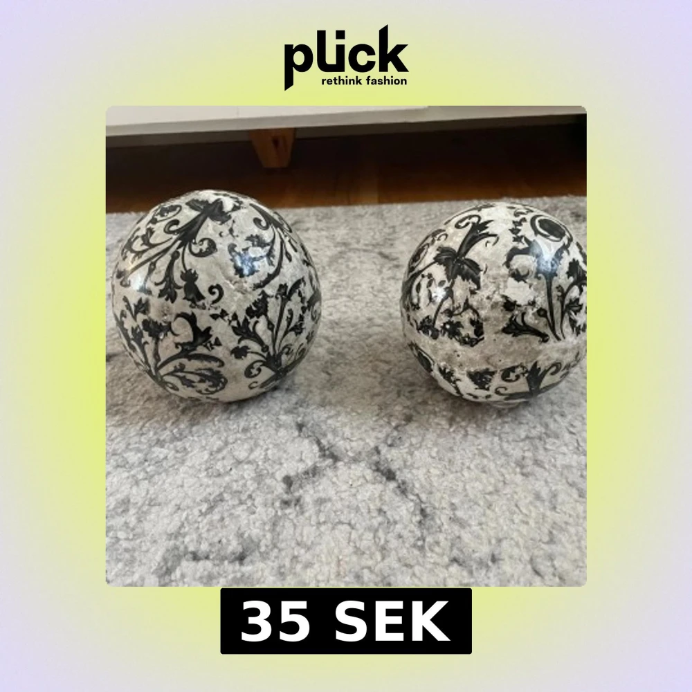 Två dekorativa klot med ett intrikat svart mönster på en vit bakgrund. Kloten har en antik look och är perfekta som inredningsdetaljer. De har små filtkuddar på undersidan för att skydda ytor.