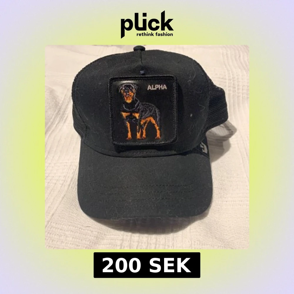Svart truckerkeps från The Farm med broderad patch framtill som visar en rottweiler och texten 'ALPHA'. Kepsen har böjd skärm, mesh baktill för extra ventilation och justerbar passform. Perfekt för dig som gillar djur och vill sticka ut med en cool accessoar.
