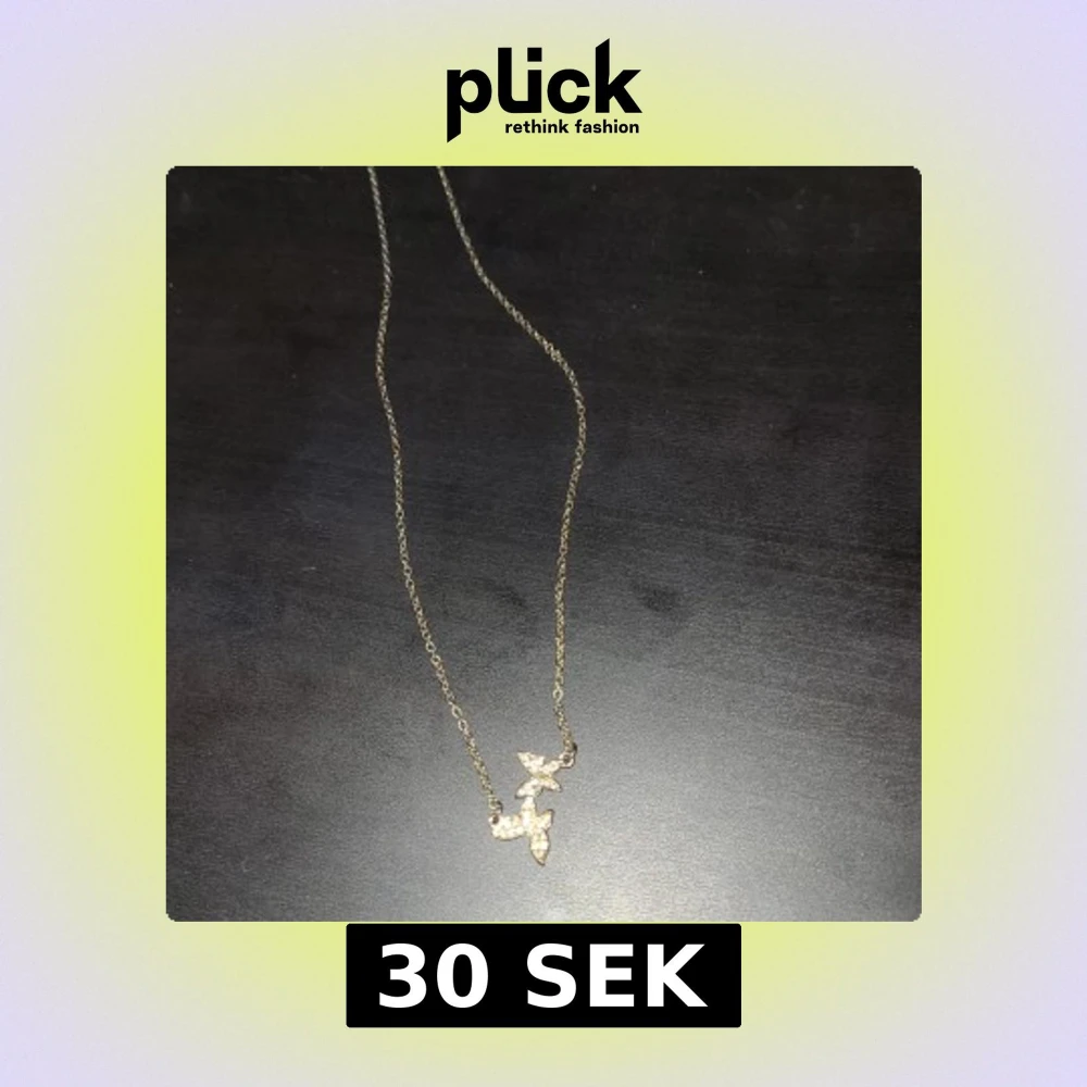 Säljer ett tunt guldigt halsband med 2 små fjärilar dekorerade med glittriga stenar. Perfekt accessoar för att lyfta din outfit med en söt detalj.