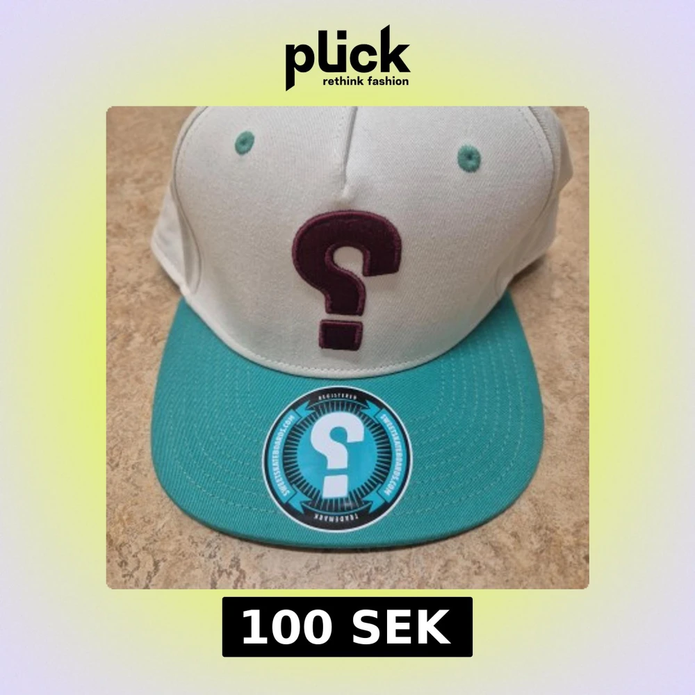 Säljer en keps från Sweet Skateboards med vit krona och turkos skärm. Framtill finns ett broderat frågetecken i vinrött. Justerbar snapback baktill. Helt ny, oanvänd.
