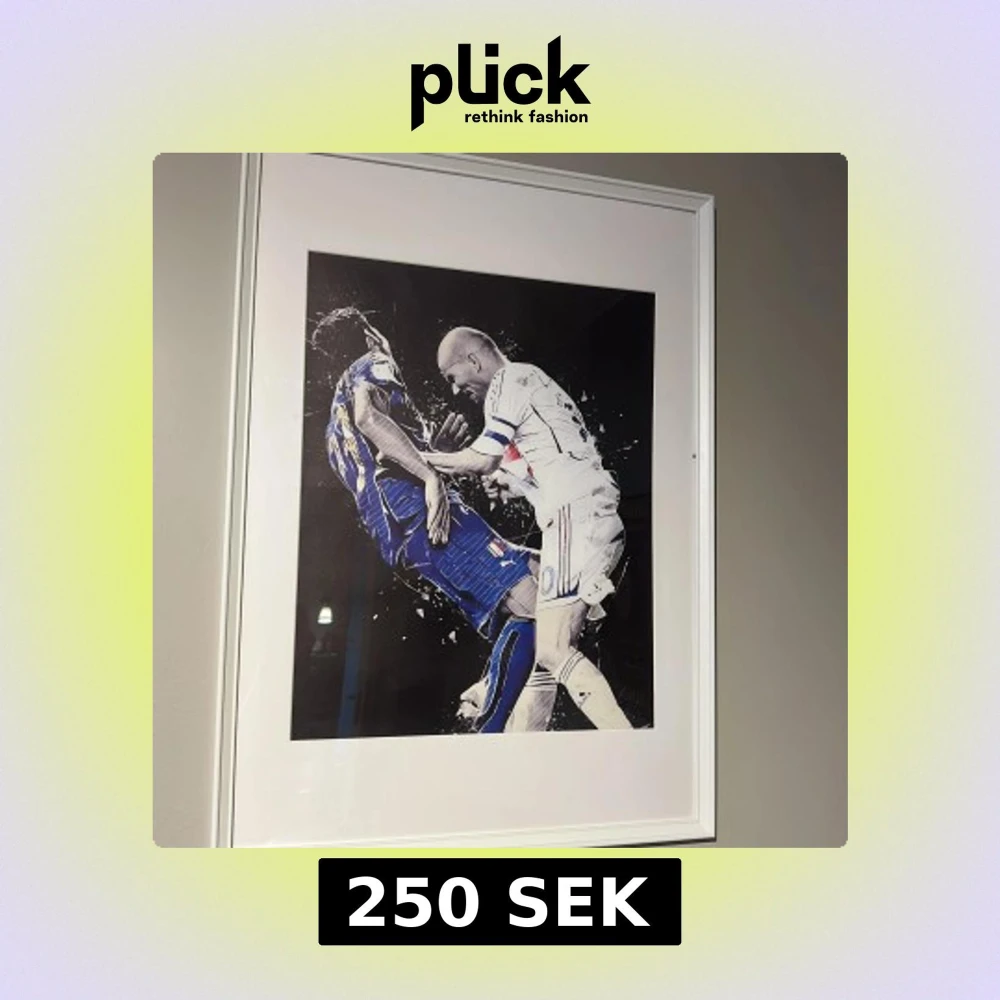 Konstverk som visar en dramatisk fotbollsscen med två spelare. Den ena bär en blå kortärmad tröja med gula detaljer, medan den andra har en vit kortärmad tröja med röda och blå inslag. Perfekt för fotbollsälskare som vill ha en ikonisk bild på väggen.