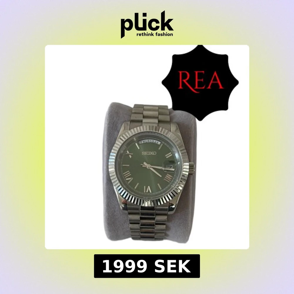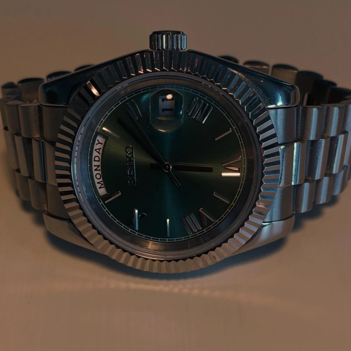 Stilren Seiko klocka med oliv-grön urtavla, romerska siffror och dag/datumvisning. Inspererad av Day-Date. Boetten och länken är i blankt silverfärgat stål och urtavlan har en snygg solreflex. Perfekt accessoar för dig som vill sticka ut med en klassisk men modern look. Alla länkar + box tillkommer självklart vid köp‼️🙌