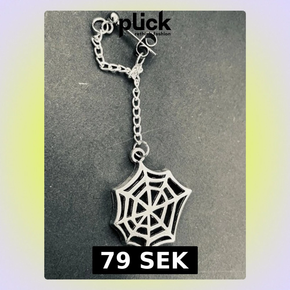 Unikt silvrigt örhänge med hängande spindelnätsberlock och kedjedetalj. Örhänget har en cool och edgy design som sticker ut, perfekt för dig som gillar alternativa accessoarer. Materialet är metall i silverfärg.