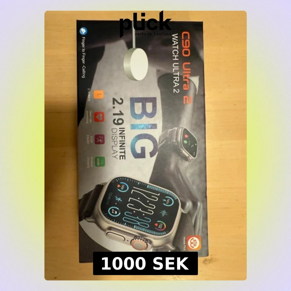 C90 Ultra 2 smartwatch med 2,19-tums stor display, svart sportarmband och metallisk boett. Klockan har funktioner som pulsmätning, stegräknare och trådlös laddning. Modern design med fyrkantig form och tydliga knappar på sidan. Perfekt för dig som gillar teknik och smarta funktioner.