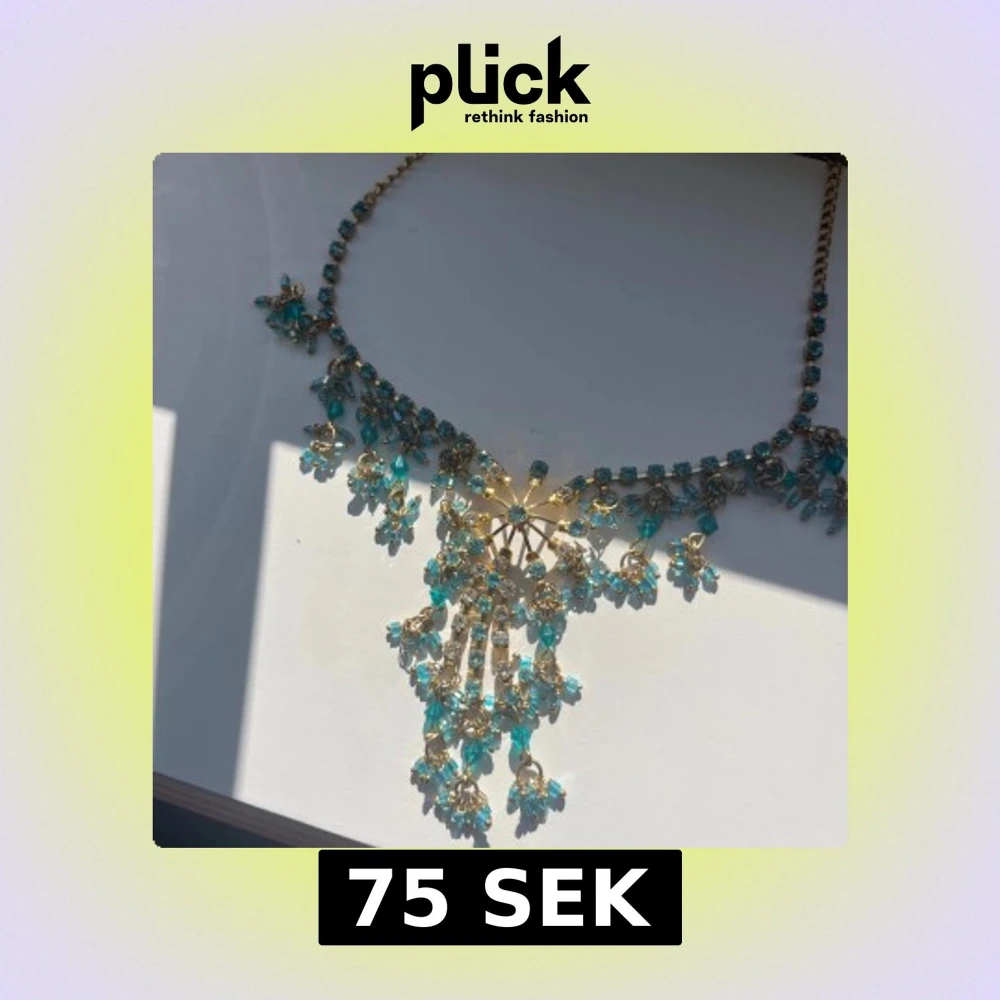 Unikt halsband med guldtonad kedja och massor av blå och klara glittrande stenar i olika former. Designen är extravagant med hängande detaljer och gnistrande pärlor som ger en lyxig känsla. Perfekt för dig som vill sticka ut och addera färg till din look.