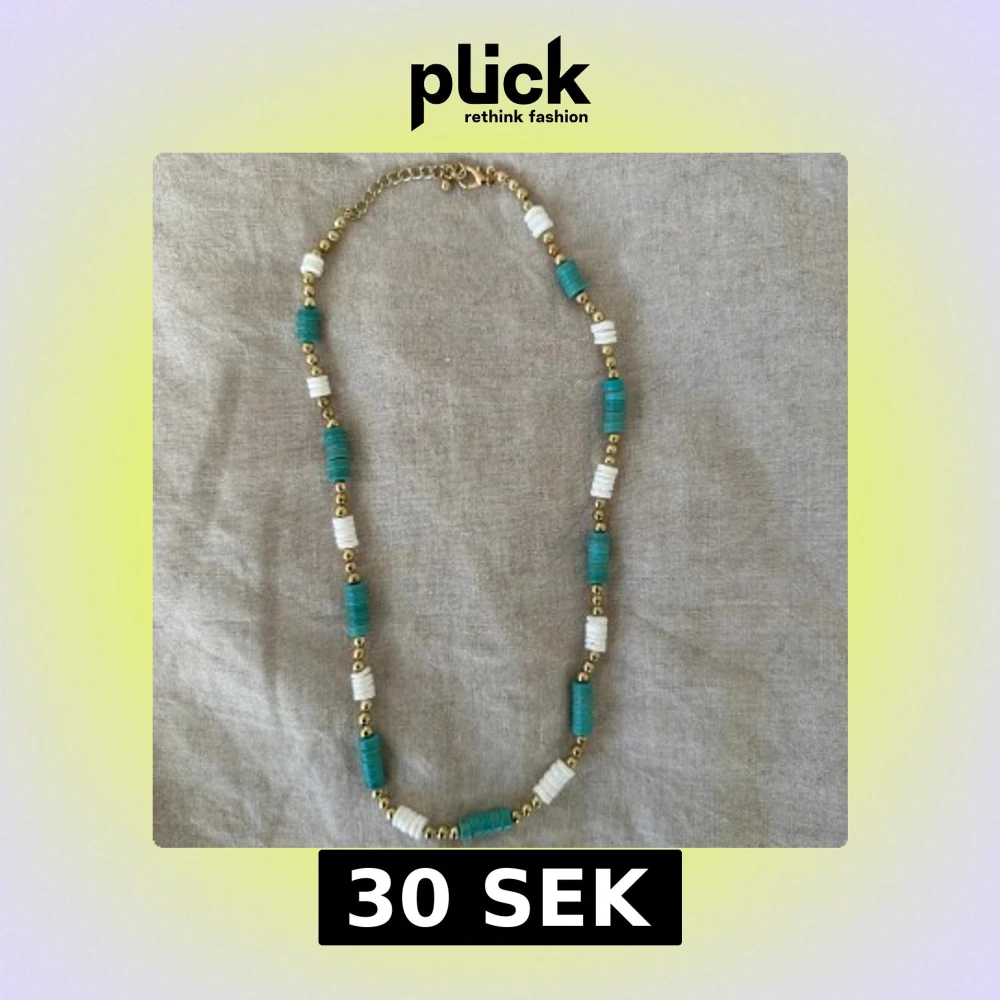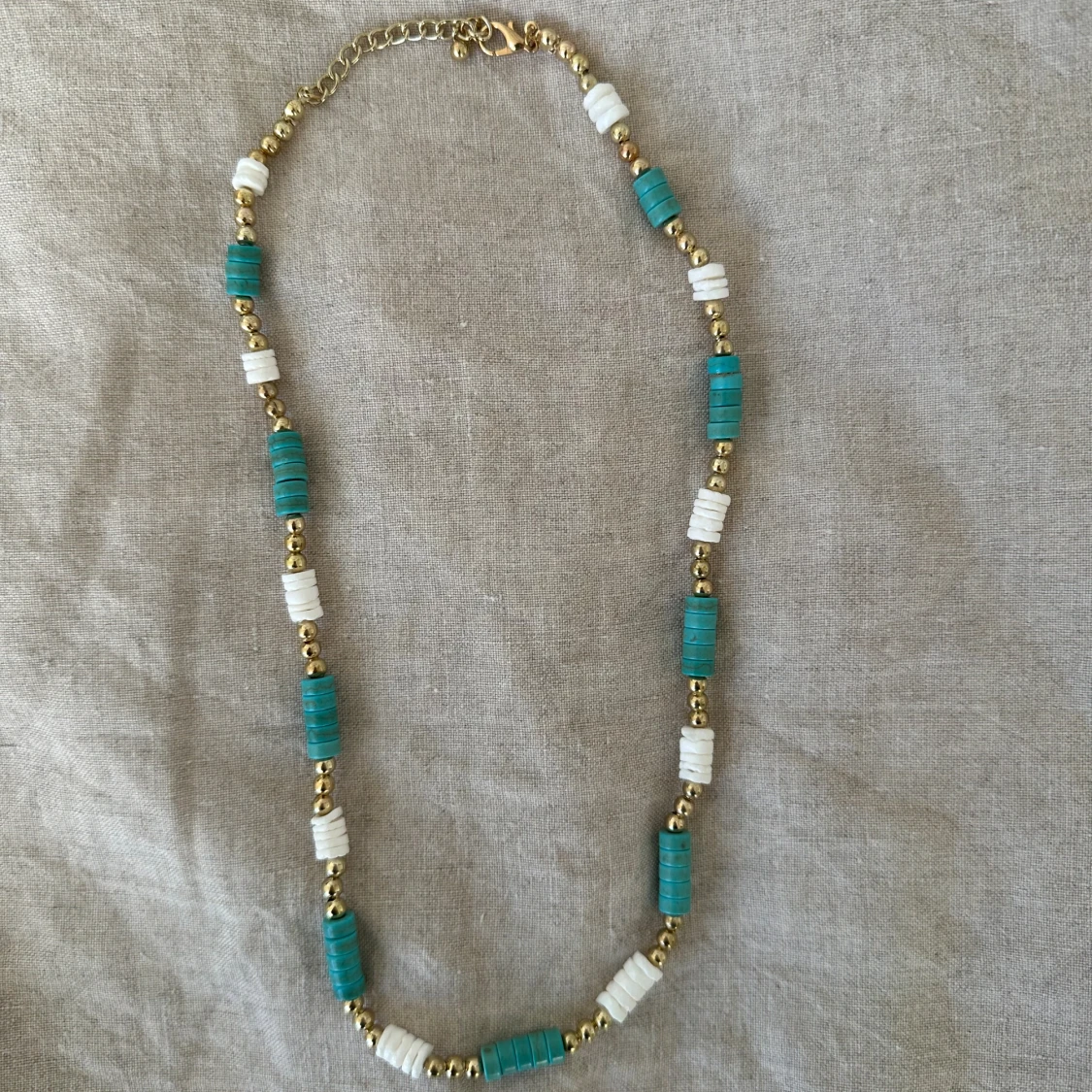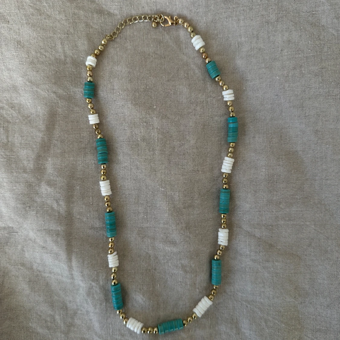 Unikt halsband med turkosa och vita cylinderformade pärlor, varvat med små guldiga kulor. Kedjan har justerbar längd och stängs med ett klassiskt spänne. Perfekt accessoar för att lyfta din outfit med färg och stil.