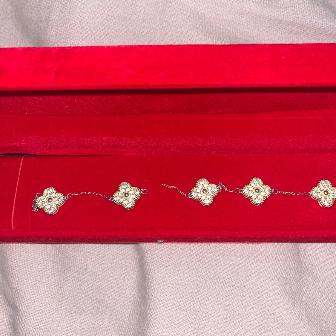 Superfint armband med fem blommiga berlocker i guldton, varje blomma har en pärlliknande detalj i mitten. Kedjan är tunn och elegant, perfekt för att ge en lyxig touch till din stil. Kommer i en snygg röd ask. Äkta silver , den har gått av men det går och laga.