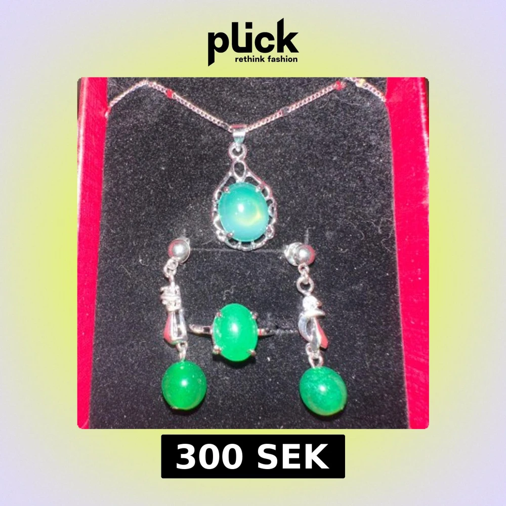 Elegant smyckeset med halsband, örhängen och ring. Varje del har en vacker grön sten infattad i silverfärgad metall. Halsbandet har en droppformad hängsmycke, örhängena är dinglande och ringen har en stor oval sten.