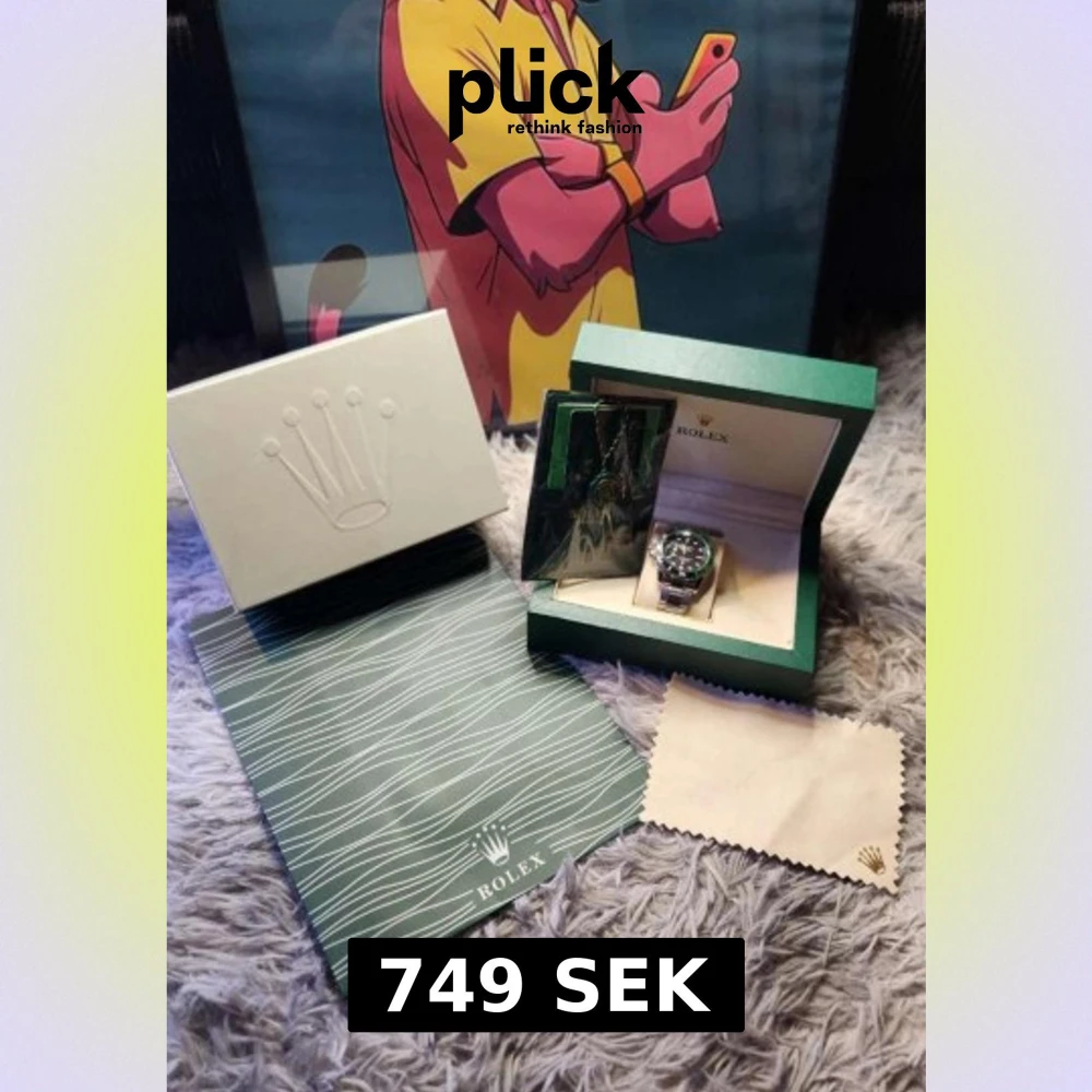 Submariner med grön bezel och svart urtavla. Klockan har en rund form och är tillverkad i silverfärgat stål med klassisk länkarmband. Levereras med originalbox, certifikat och putsduk. Perfekt för dig som gillar ikonisk design och vill ha något riktigt stilrent på handleden.