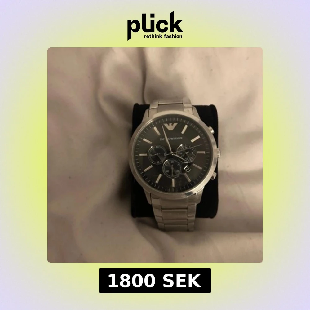 Stilren klocka från Emporio Armani med silverfärgat armband i rostfritt stål och svart urtavla. Klockan har kronograf-funktion, datumvisning och klassisk rund form. Snygga detaljer med logga på både urtavla och spänne. Perfekt accessoar för dig som gillar en clean look.