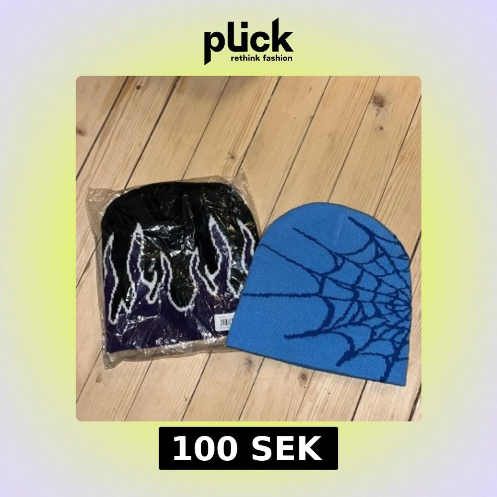 Säljer två coola mössor. Den ena är svart med vita och lila flammor, och den andra är blå med ett spindelnätsmönster. Perfekta för att ge din outfit en unik touch!