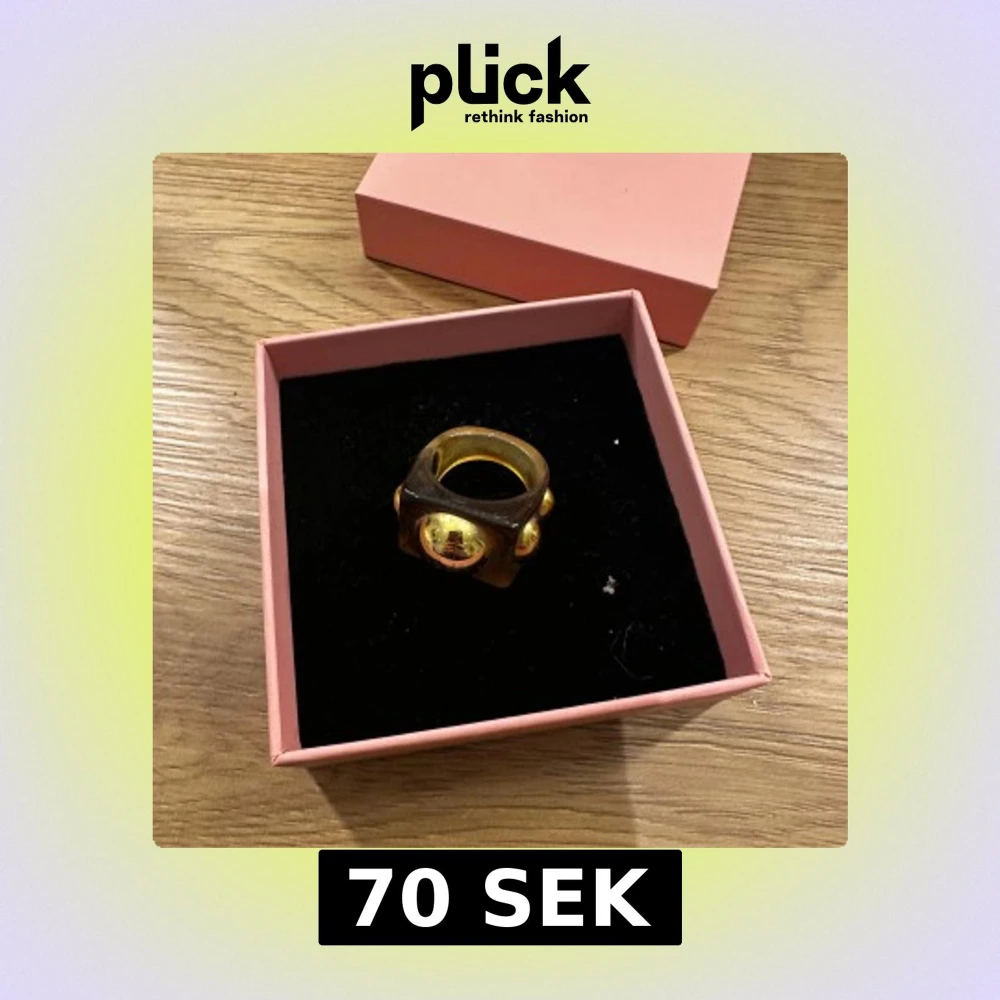 Säljer en unik guldfärgad ring med stora, iögonfallande detaljer. Från lizmo, har en liten repa på stenen i mitten