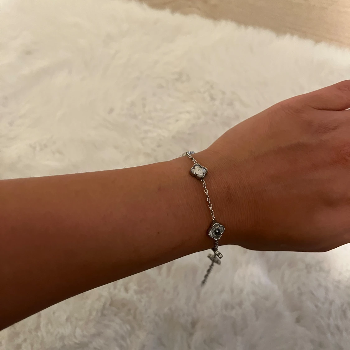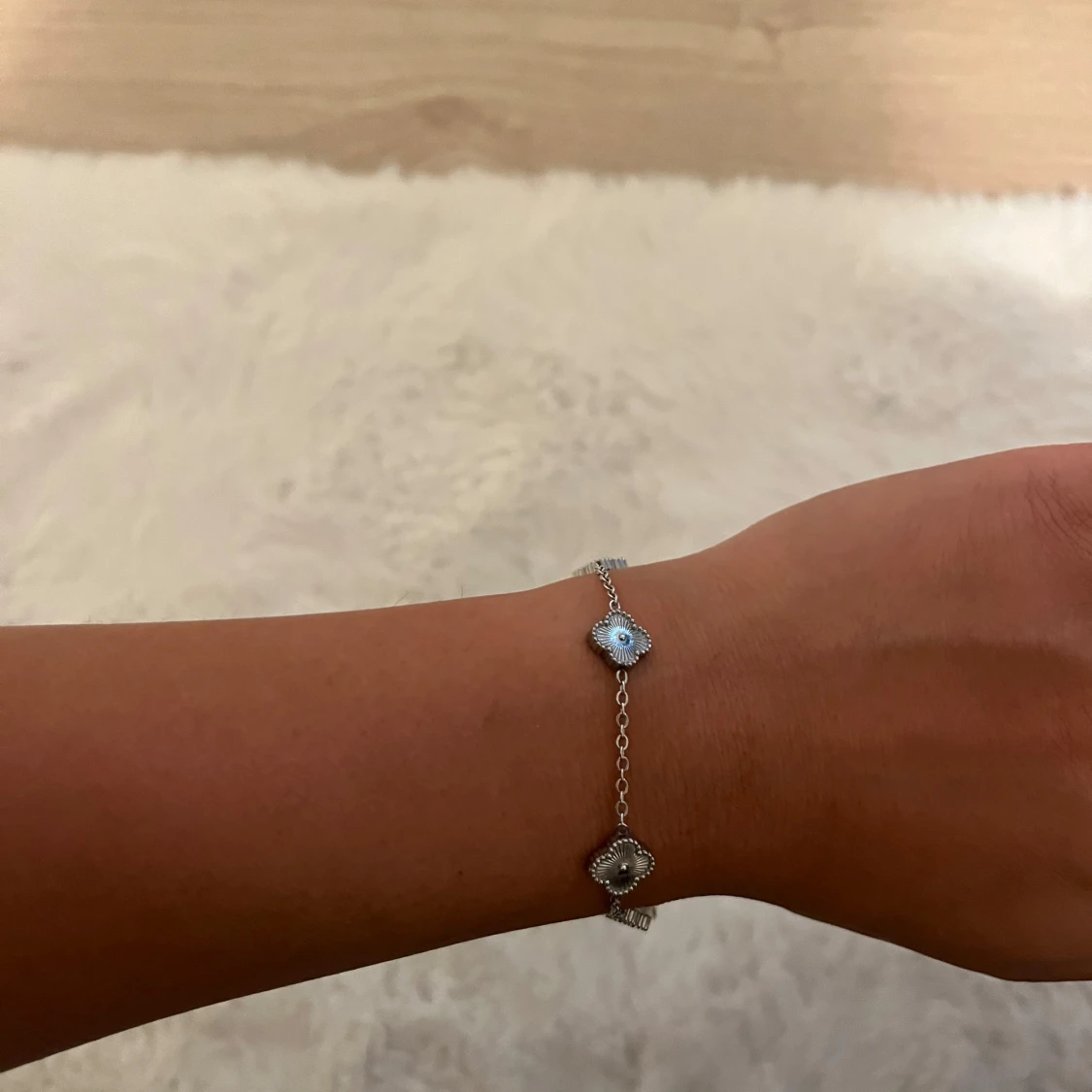 Snyggt och stilrent armband i silverfärg med små blommor som har en glansig, detaljerad yta. Kedjan är tunn och smidig, och blommorna är jämnt placerade längs armbandet för en elegant look. Perfekt för dig som gillar diskreta men unika smycken.