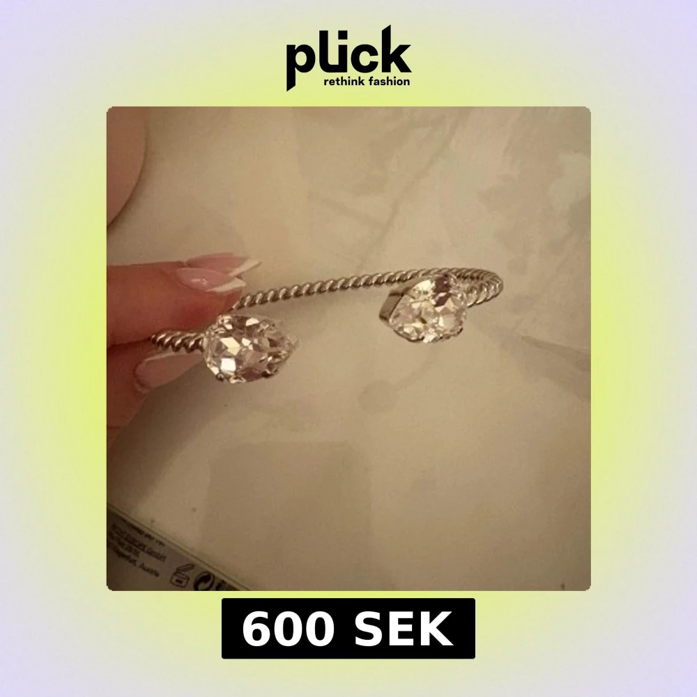 Elegant armband i silverfärg med två stora glittrande kristaller. Armbandet har en vriden design som ger en unik touch. Perfekt för att lägga till lite glamour till din outfit. Köpt för 795 kr knappt använt då den är för stor för min arm.