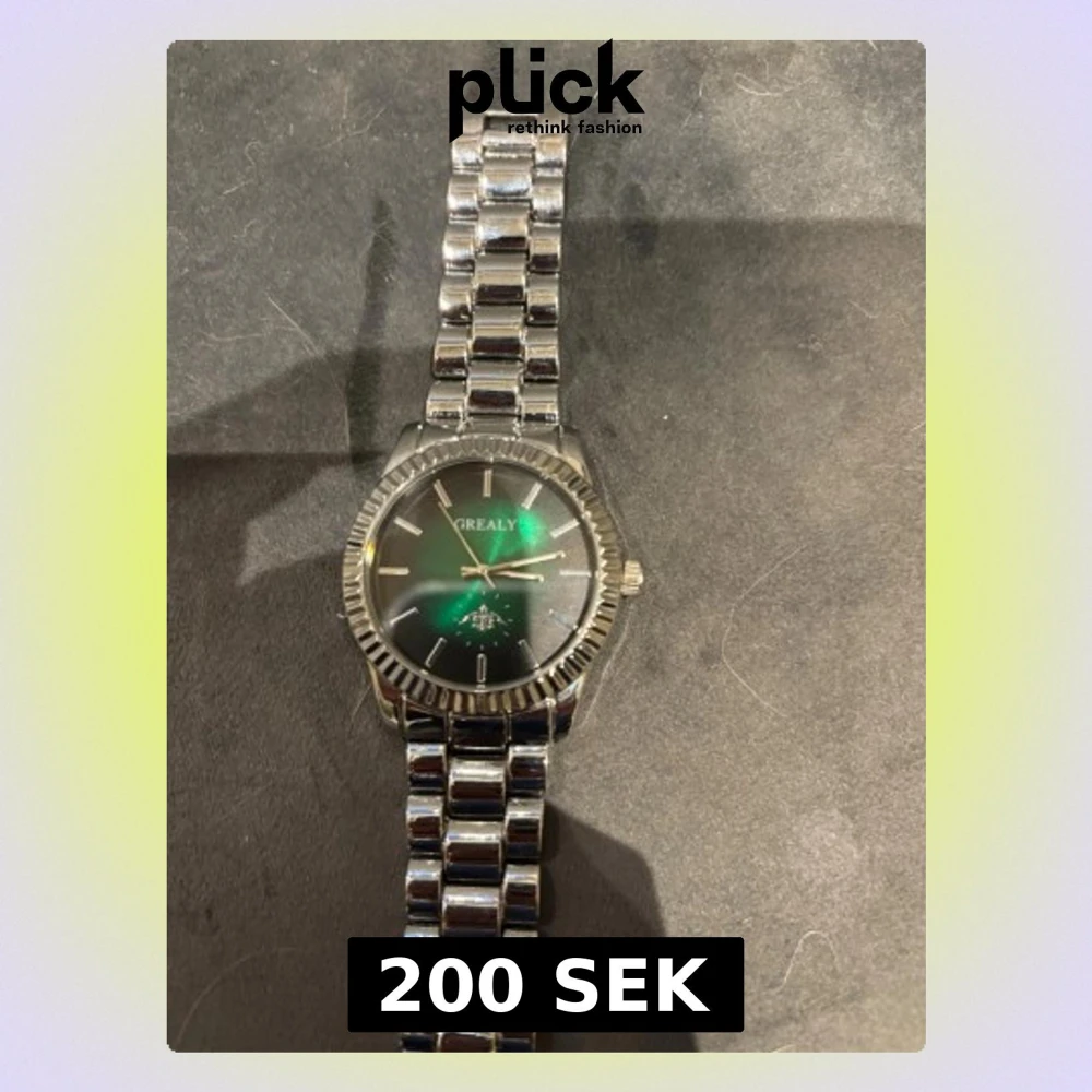 Stilren klocka från Grealy med rund svart urtavla och silvrigt armband i metall. soppskuren boett och tydliga indexmarkeringar. Klassisk design som passar till många olika stilar. Länkat armband ger en modern känsla.