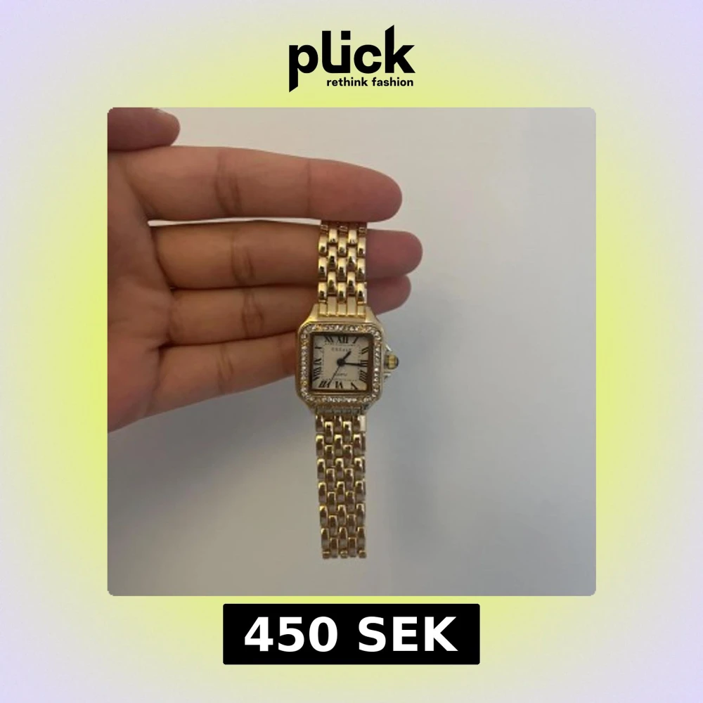 Elegant guldfärgad klocka med fyrkantig urtavla och romerska siffror. Klockan har en glittrig ram och en länkarmband i guld. Storlek går att ändra. Pris kan diskuteras vid snabb affär