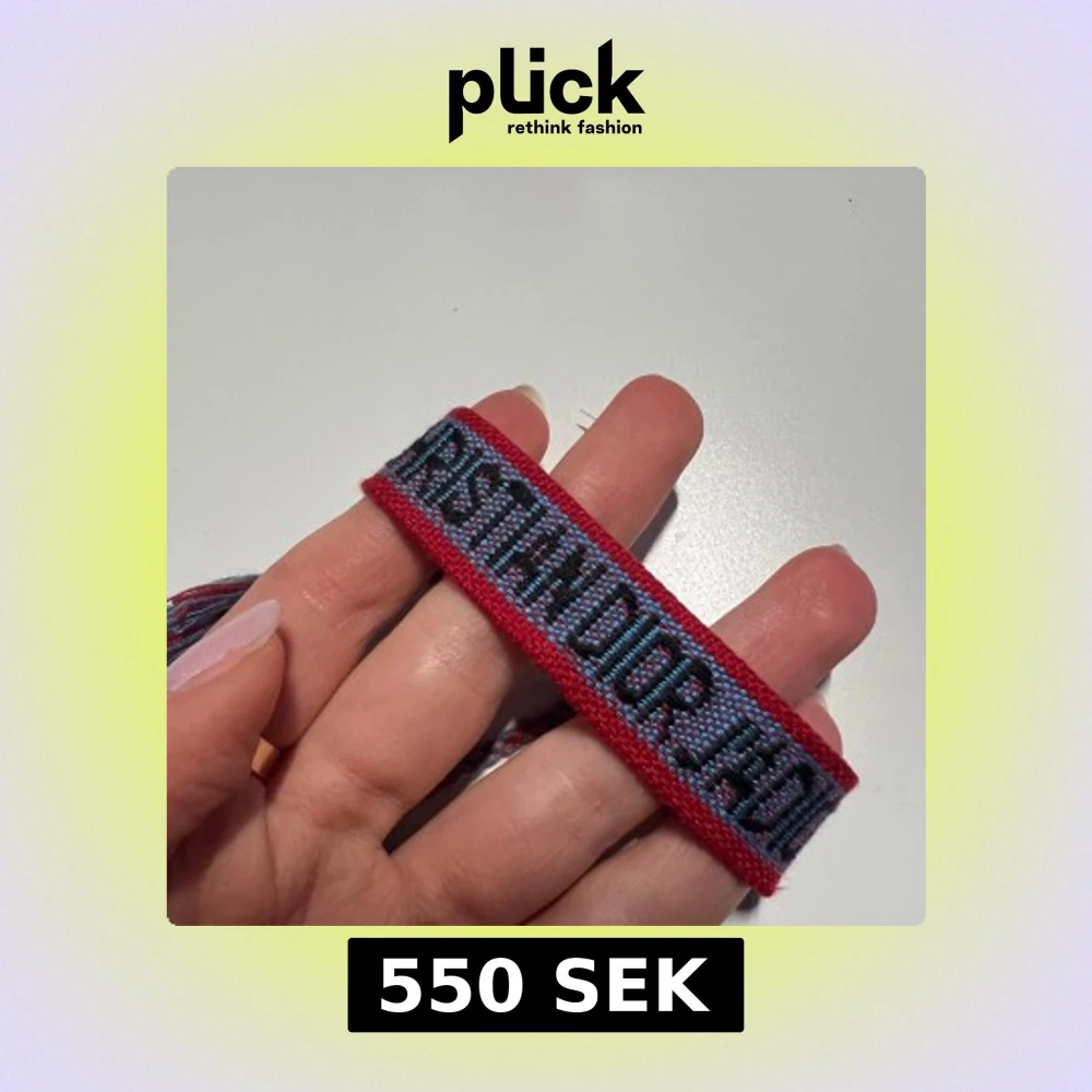 Unikt armband från Christian Dior i rött och blått med dekorativa tofsar. Perfekt för att ge en färgglad touch till din outfit. Bältet har en vävd text och hjärtdetalj som ger en personlig stil.