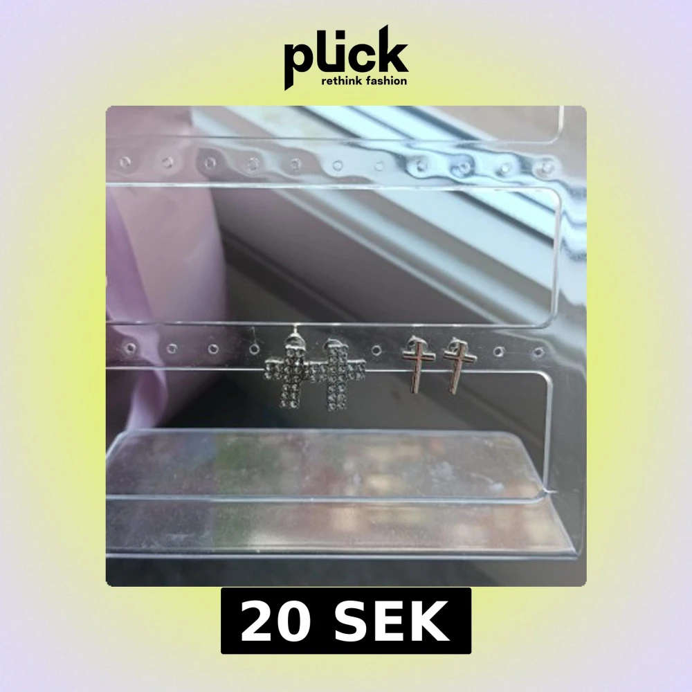 Säljer två par korsformade örhängen i silverfärg. Ett par är dekorerade med glittrande stenar och det andra paret är enkla och stilrena. Perfekta för dig som gillar att mixa och matcha smycken.