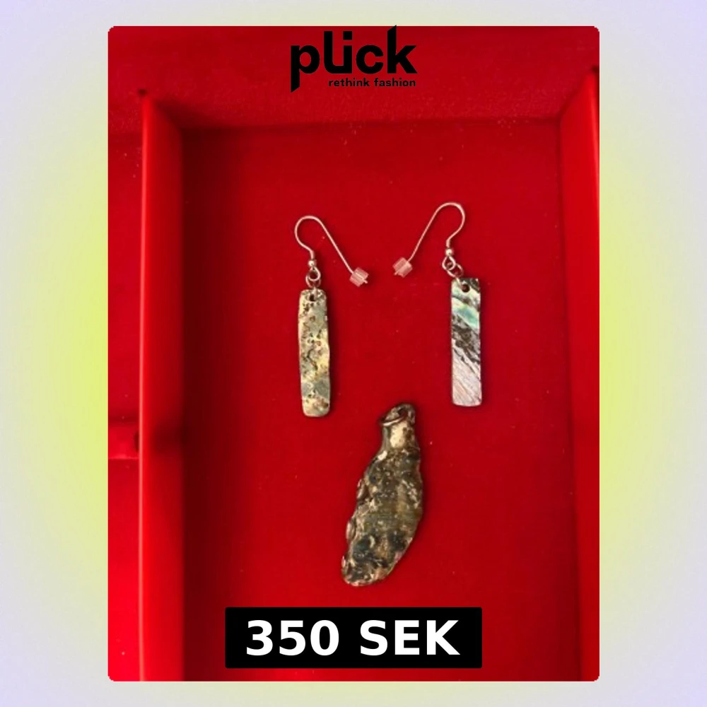Säljer ett par örhängen med rektangulära hängen i äkta silver och pärlemor, samt ett matchande organiskt format hänge. Örhängena har krokfästen och detaljerad yta med naturliga färgskiftningar i silver, grått och blått. Perfekt för dig som gillar unika smycken med konstnärlig vibe.