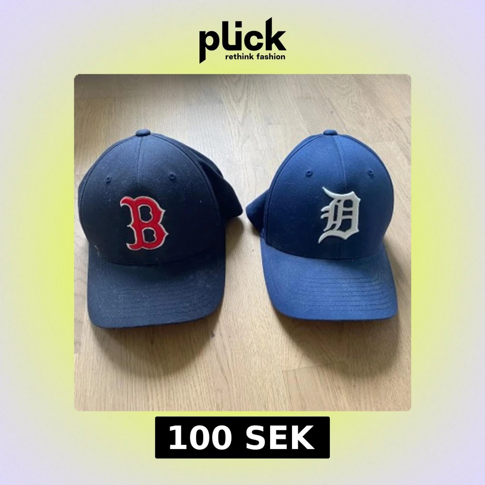 Två klassiska basebollkepsar i mörkblått, en med Boston Red Sox röd B-logga och en med Detroit Tigers vit D-logga framtill. Båda har böjd skärm och är tillverkade i bomull. Perfekta för sportiga outfits eller streetwear.