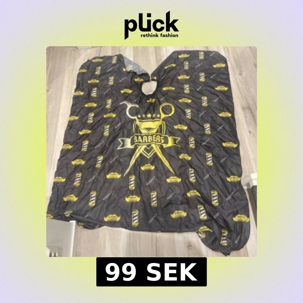 Barberarkappa i svart med coolt gult tryck och motiv av saxar, rakknivar och mustascher. Elastisk halsöppning för enkel användning. Perfekt för hemmaklippning eller barbershop-vibe. Materialet är lätt och syntetiskt, skyddar kläderna under klippning.