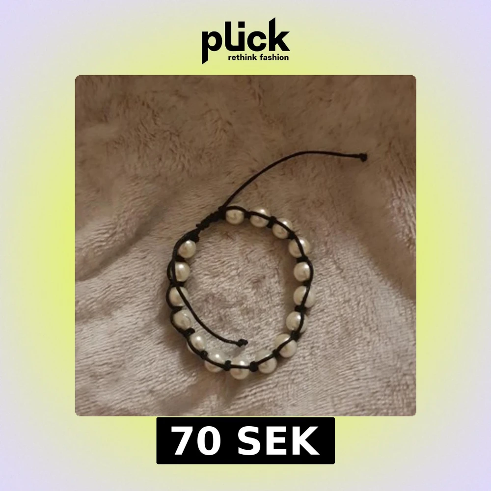 Snyggt handgjort armband med vita pärlor och svart snörning. Pärlorna är jämnt fördelade längs ett svart band som kan justeras med knytning. Perfekt för dig som gillar stilrena accessoarer med en twist. Passar både till jeans och klänning.
