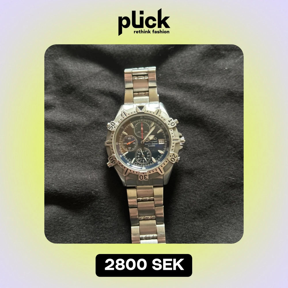 Säljer en snygg och robust Seiko-klocka från 1992 i silverfärgat stål. Den har en mörk urtavla med flera små urtavlor och datumvisning. Armbandet är i rostfritt stål och har en säker låsning. Perfekt för både vardag och fest. Original pris ligger runt 4500-5000.