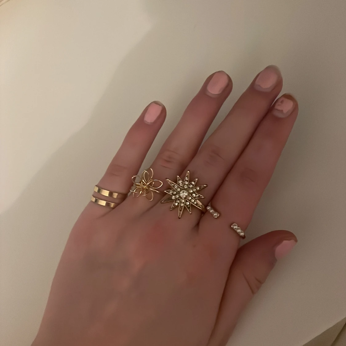 Säljer ett set med eleganta ringar i guld och pärlor. Setet innehåller flera olika designer, inklusive en ring med pärlor, en med en blomliknande design och en enkel guldpläterad ring. Perfekt för att mixa och matcha efter stil och tillfälle. En för 10 ellet alla ( 4 på en hand) för 30kr