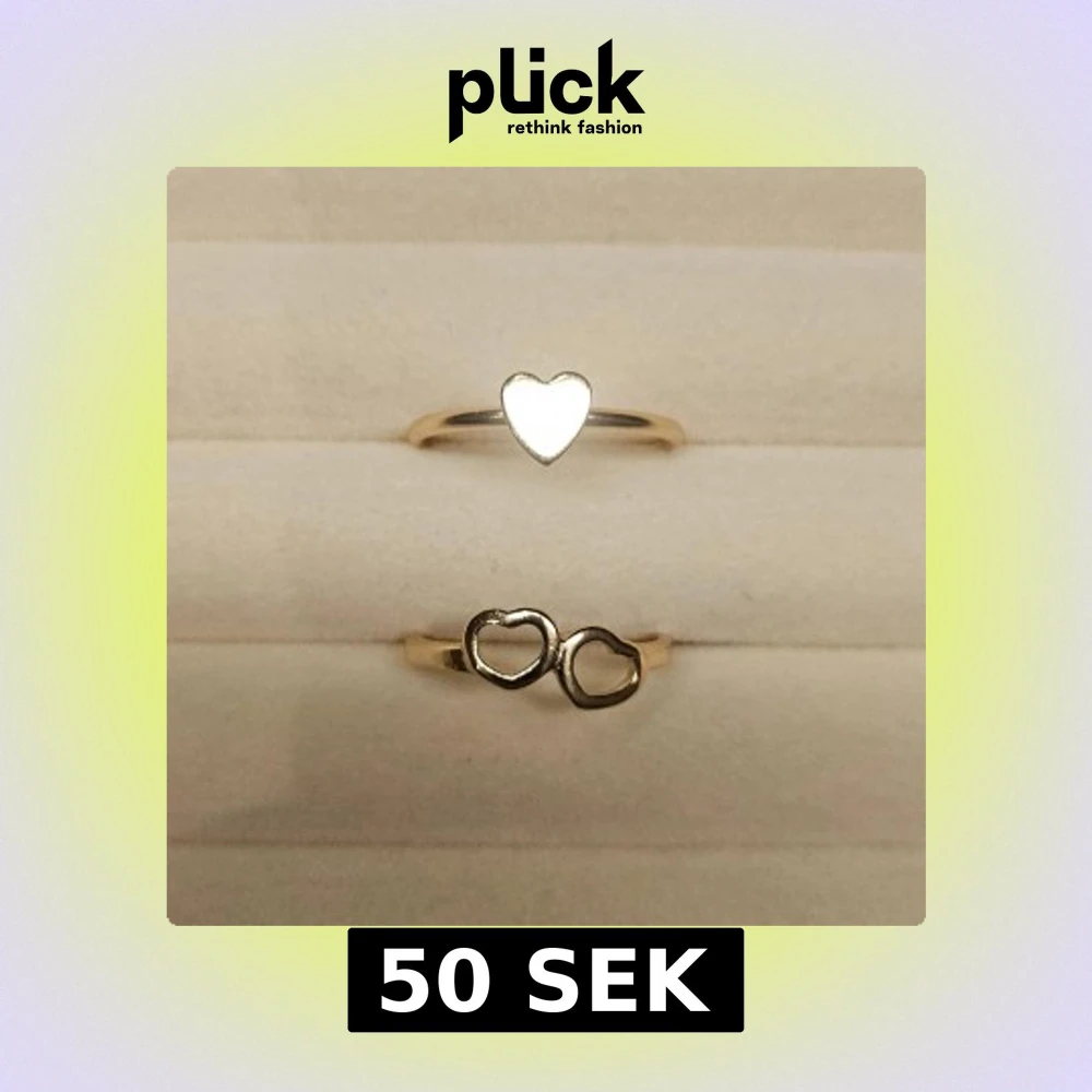 Säljer två tunna guldiga ringar, en med ett fyllt hjärta och en med två öppna hjärtan. Perfekta att bära tillsammans eller var för sig för en söt och romantisk look.