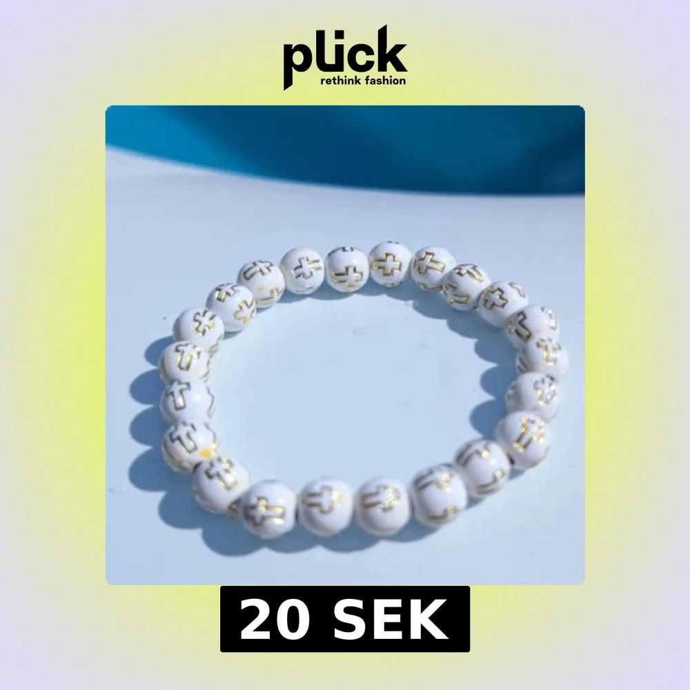 Stilrent armband med vita runda pärlor, dekorerade med guldfärgade kors på varje pärla. Perfekt accessoar för dig som gillar unika detaljer och enkel design. Elastiskt band gör det lätt att ta på och av. Passar yngre barn nytt