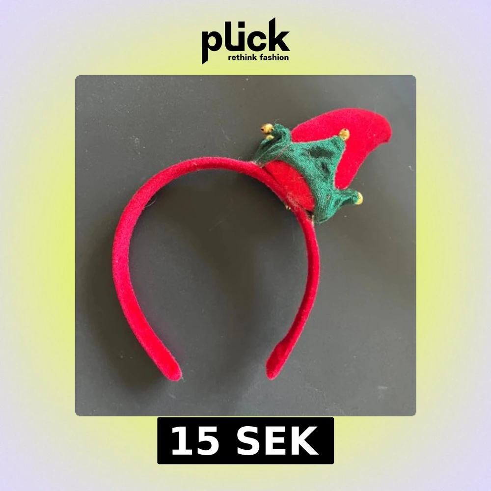 Juligt rött diadem med en liten tomteluva i röd och grön sammet, dekorerad med små guldfärgade bjällror.