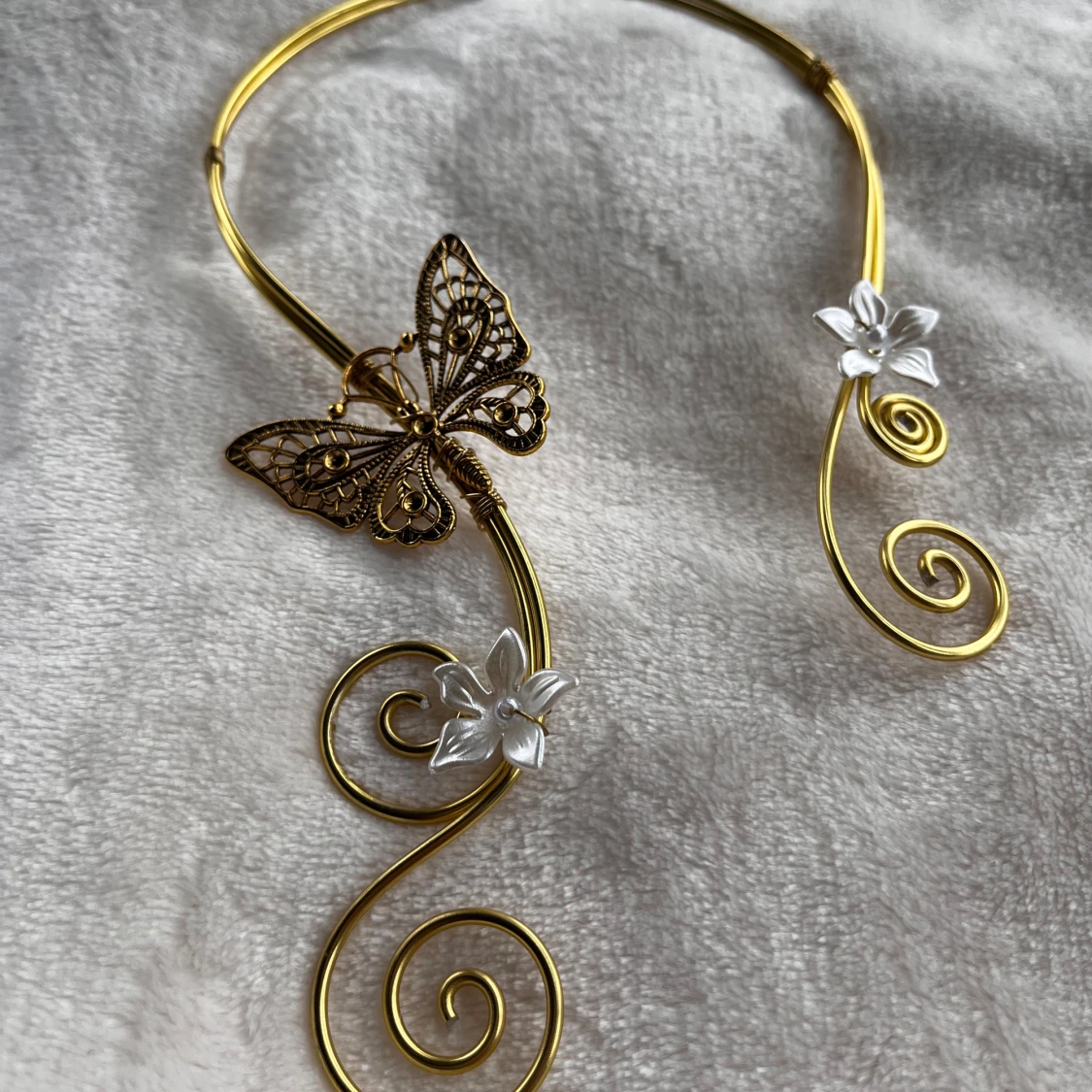 Unikt halsband i guldtonad metall med snirkliga former, dekorerat med en detaljerad fjäril och två vita blommor. Statement-piece som verkligen sticker ut och ger en magisk touch till din look.