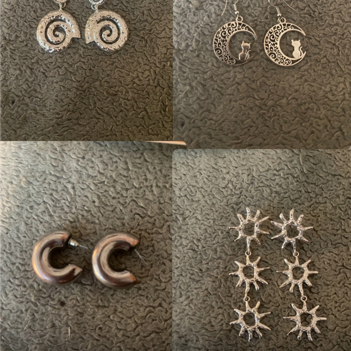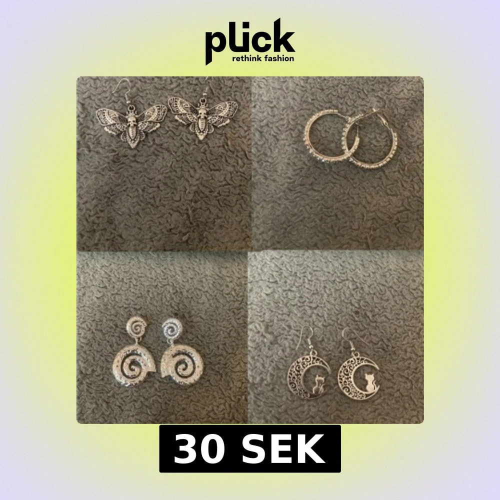 Säljer ett set med sex par unika örhängen i silverfärg. Inkluderar fjärilar med detaljer, klassiska hoops, spiralformade örhängen, månar med kattmotiv, chunky halvcirklar och långa örhängen med stjärnliknande former. Perfekt för dig som vill variera din stil och sticka ut. En säljs för 30kr, om man köper flera kan jag skicka dom i samma paket alltså bara en fraktkostnad. Skriv vid frågor!