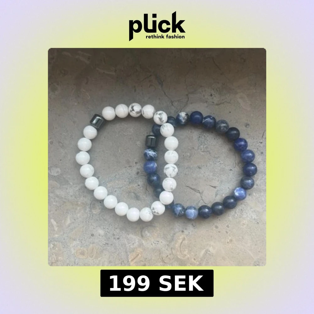Säljer två elastiska armband med runda pärlor, ett i vit marmorlook och ett i blåmelerad sten. Båda har en metallisk cylinderpärla som detalj. Perfekta att bära tillsammans eller var för sig för en stilren vibe. Gå in i min profil för att köpa de separat!