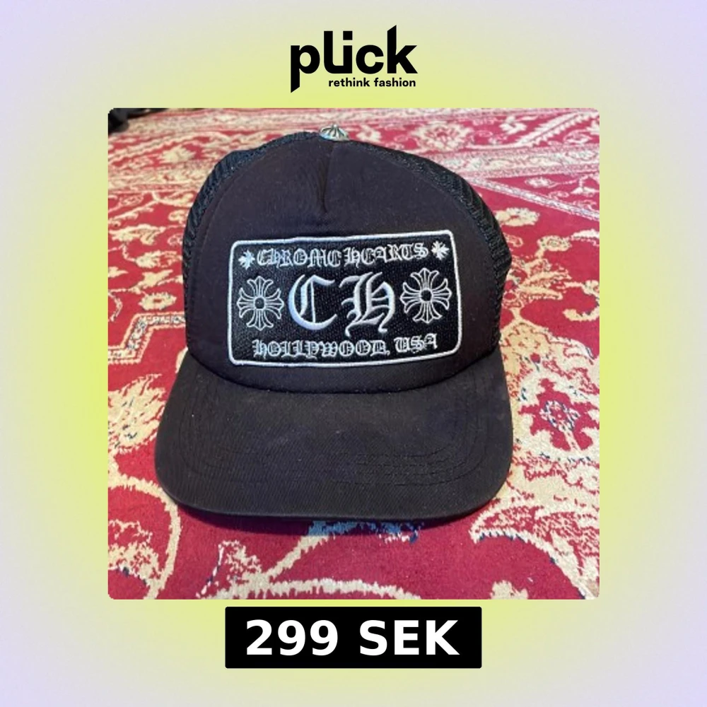 Svart truckerkeps från Chrome Hearts med vit broderad patch framtill och ikoniska CH-loggan. Kepsen har mesh på sidorna och bak, böjd skärm och justerbar passform. Snygg kontrast mellan svart tyg och vit brodyr, perfekt för en edgy streetwear-look.