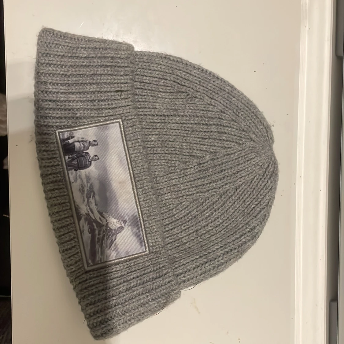Säljer en grå ribbstickad mössa med bred uppvikt kant. På framsidan sitter en rektangulär patch med svartvitt motiv av två personer och ett berg i bakgrunden. Perfekt för dig som gillar stilrena accessoarer med unik detalj.