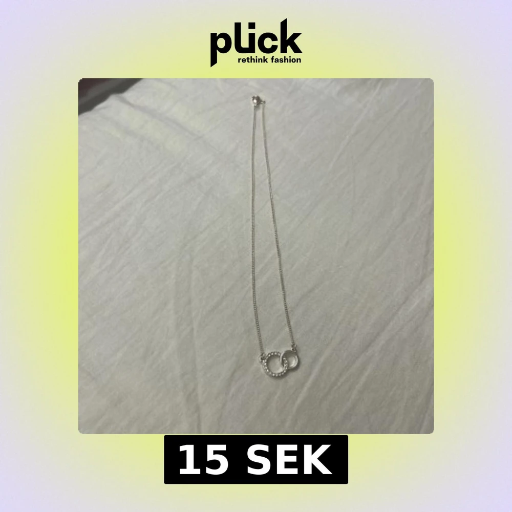 Stilrent halsband i silver med två sammanlänkade ringar, varav en är dekorerad med små gnistrande stenar och den andra är slät. Perfekt för dig som gillar minimalistiska smycken med en touch av elegans.