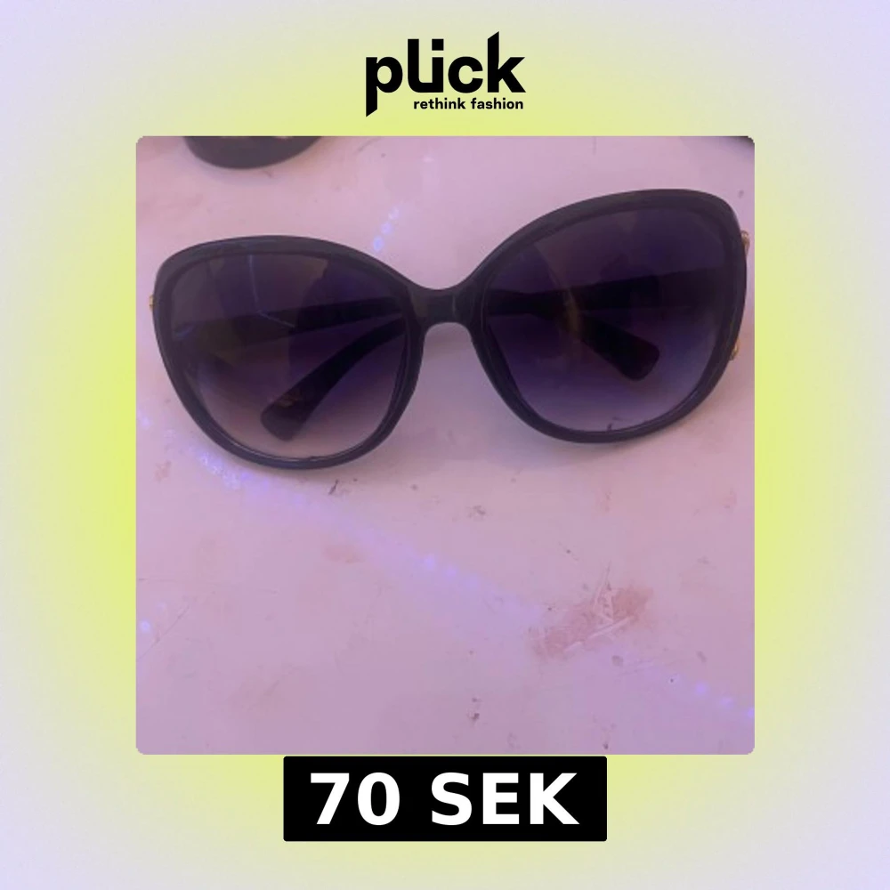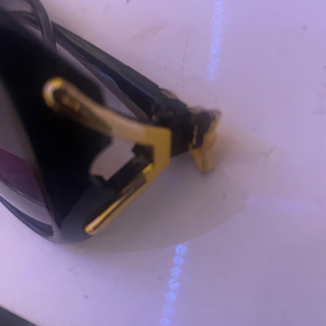 Säljer ett par svarta solglasögon med coola guldfärgade detaljer på skalmarna. Glasögonen har en markerad båge och mörka glas. Perfekt accessoar för att lyfta din stil och ge en lyxig känsla till outfiten.