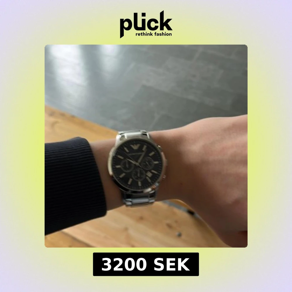 Snygg klocka från Emporio Armani med svart urtavla och silverfärgat armband i metall. Klockan har kronograf-funktion och tydliga indexmarkeringar. Perfekt accessoar för dig som gillar stilrena detaljer och klassisk design. Köpte den tidigare detta år för 5400kr