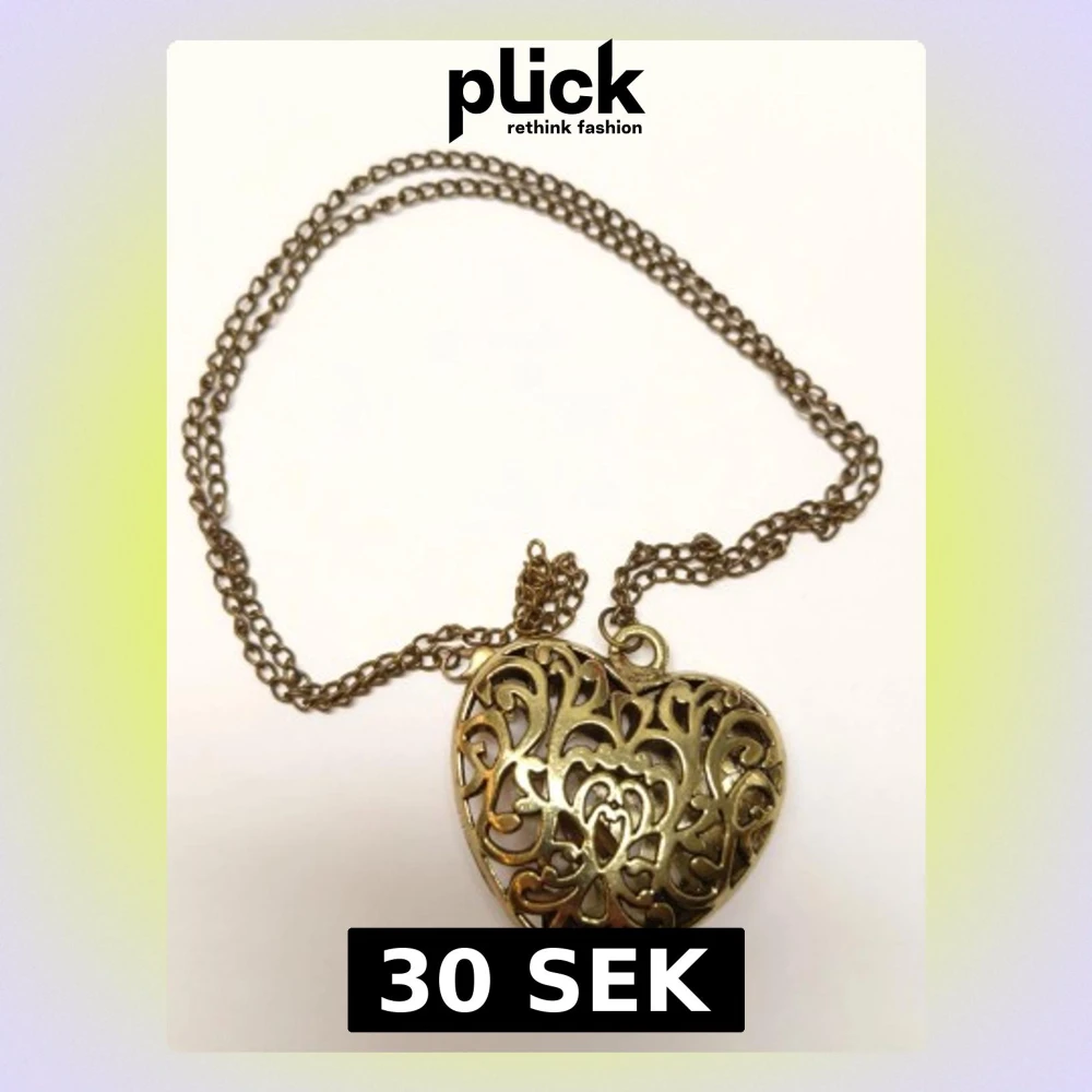 Halsband med ett stort hjärtformat hänge. Kedjan är 68cm lång. Guldfärgad metall