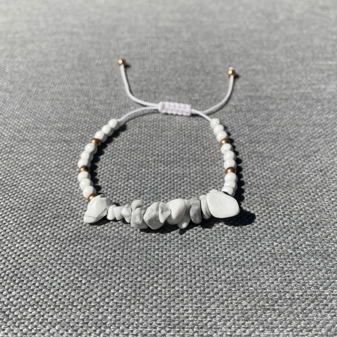 Stilrent armband med vita och gråmelerade pärlor samt stenar. Justerbar knytning med små guldfärgade detaljer. Perfekt accessoar för en fräsch och modern look.