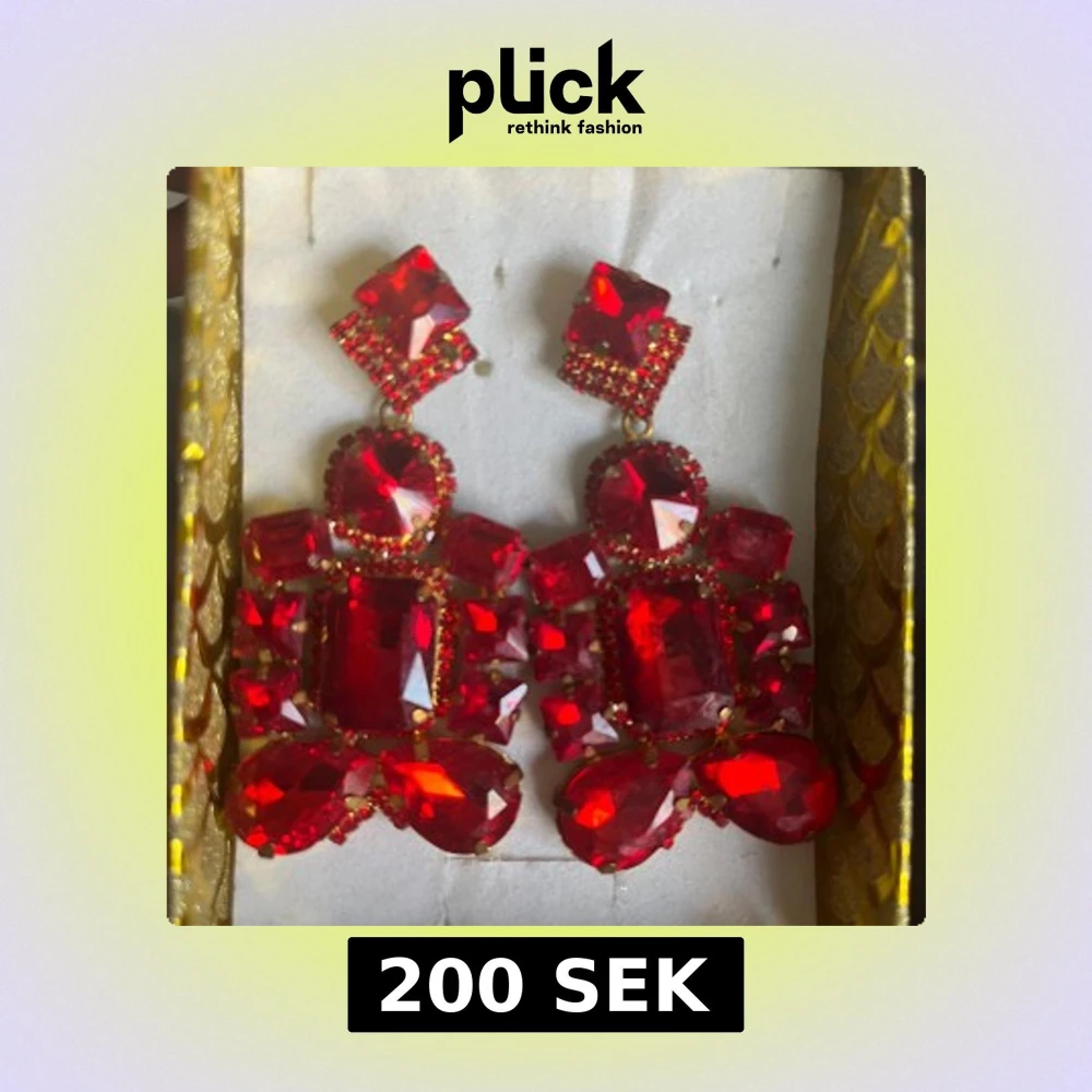 Säljer ett par riktigt iögonfallande örhängen med stora röda stenar i olika former. Örhängena är glittriga och har en lyxig känsla med sina många facettslipade stenar. Perfekta för dig som vill sticka ut och addera färg till din look.