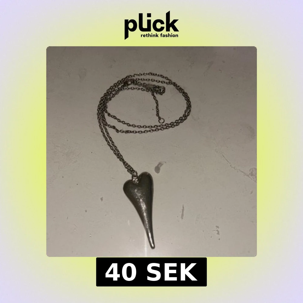 Snyggt silverfärgat halsband med ett unikt, avlångt hjärta som hänge. Kedjan är tunn och lång.💖