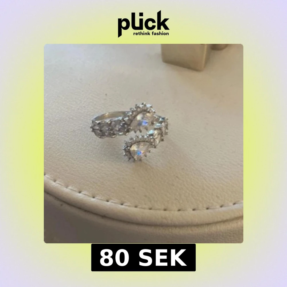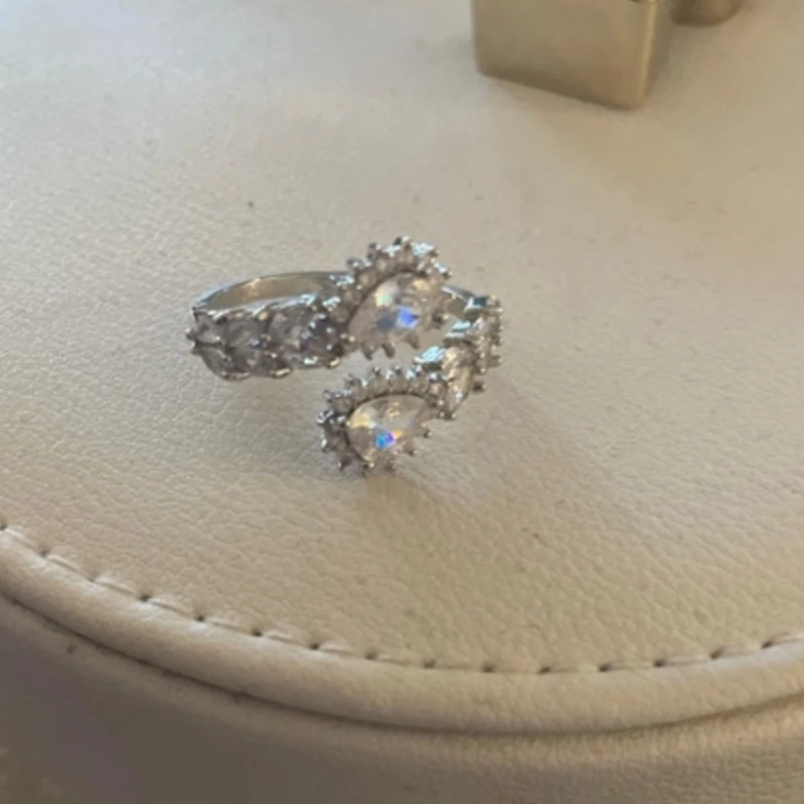 Silverring med två stora droppformade, gnistrande stenar och mindre stenar runtom. Använd någon gång