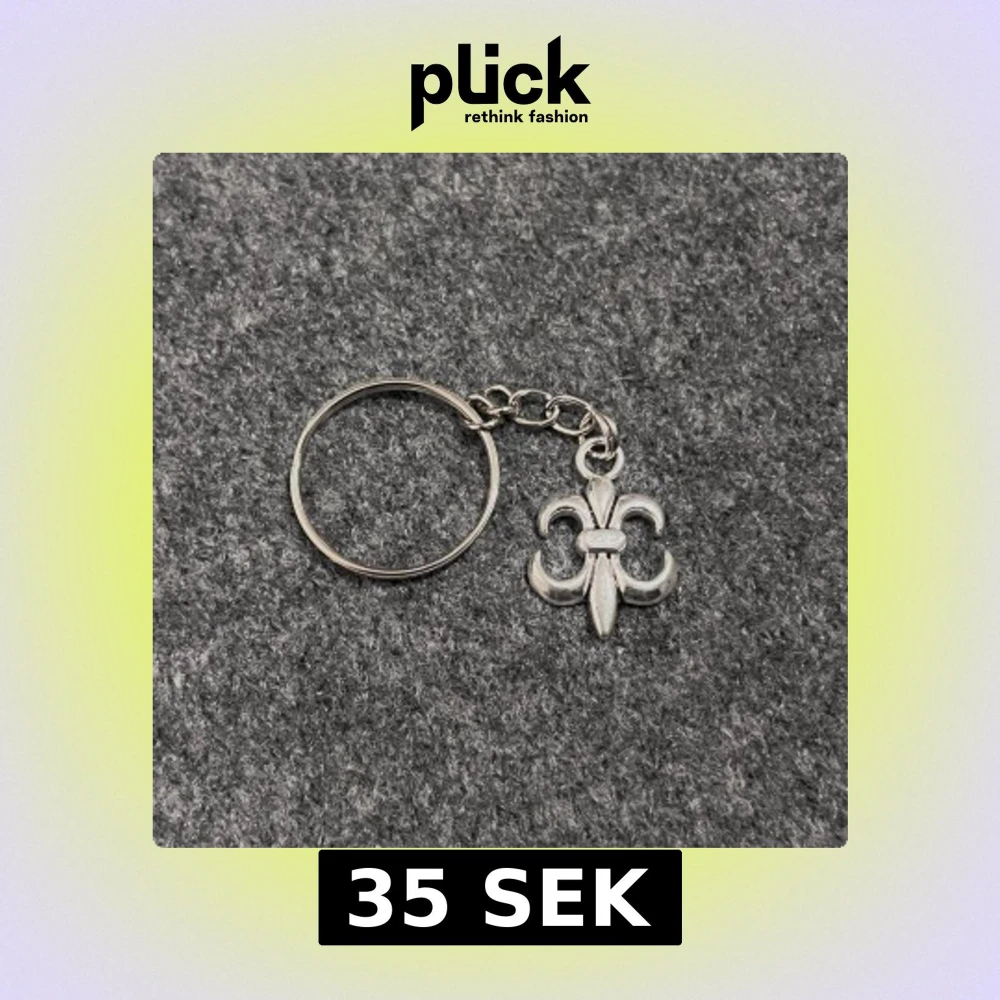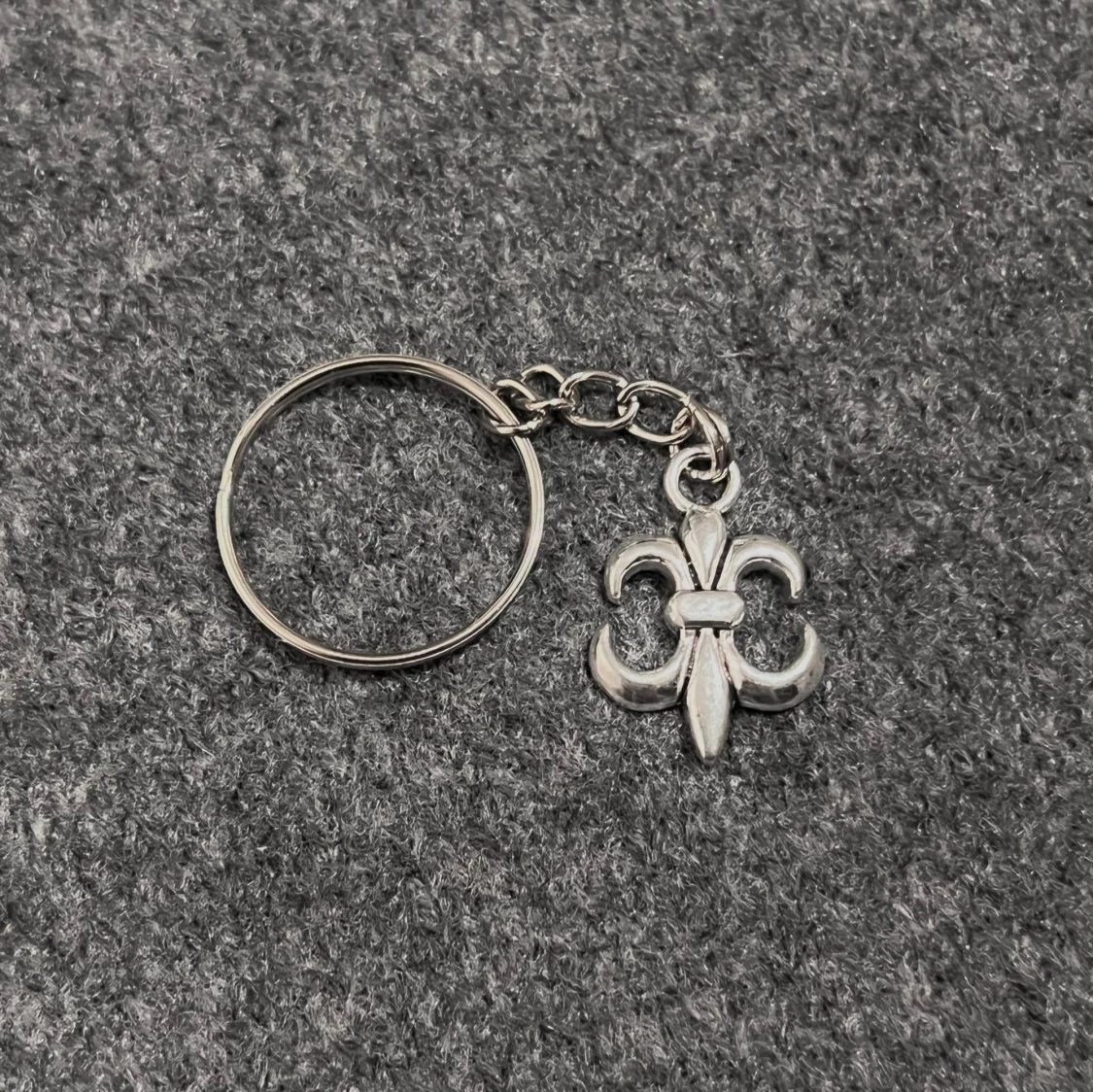 Stainless steel keyring with a polished fleur-de-lis pendant. Elegant and timeless.