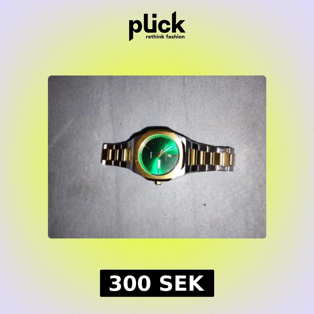 Stilren herrklocka med grön urtavla och dag/datumvisning. Armbandet är i metall med både guld- och silverfärgade länkar. Klockan har en rund boett i guldton och klassisk design som sticker ut med sin färgkombination.