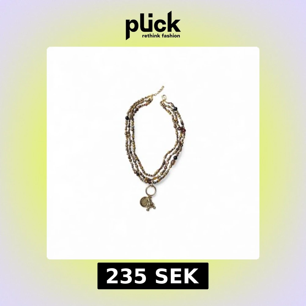 Unikt halsband med flera rader små pärlor i guld, brunt och svart. Halsbandet har ett stort guldfärgat hänge. Perfekt statement-piece för dig som gillar detaljer och coola accessoarer. Halsbandet är ihopsatt och omgjort av delar från vintage smycken, 90tal (skick därefter) helt unikt och one of a kind. (Eftersom det är vintage så förekommer defekter och slitage så som exempelvis missfärgningar, se bilder)