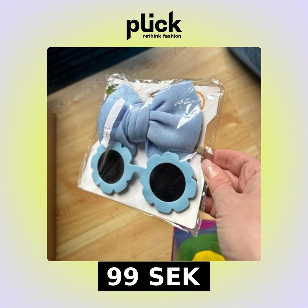 Söta solglasögon med blå blommiga bågar och en matchande stor rosett. Perfekta för en lekfull och stilfull look.