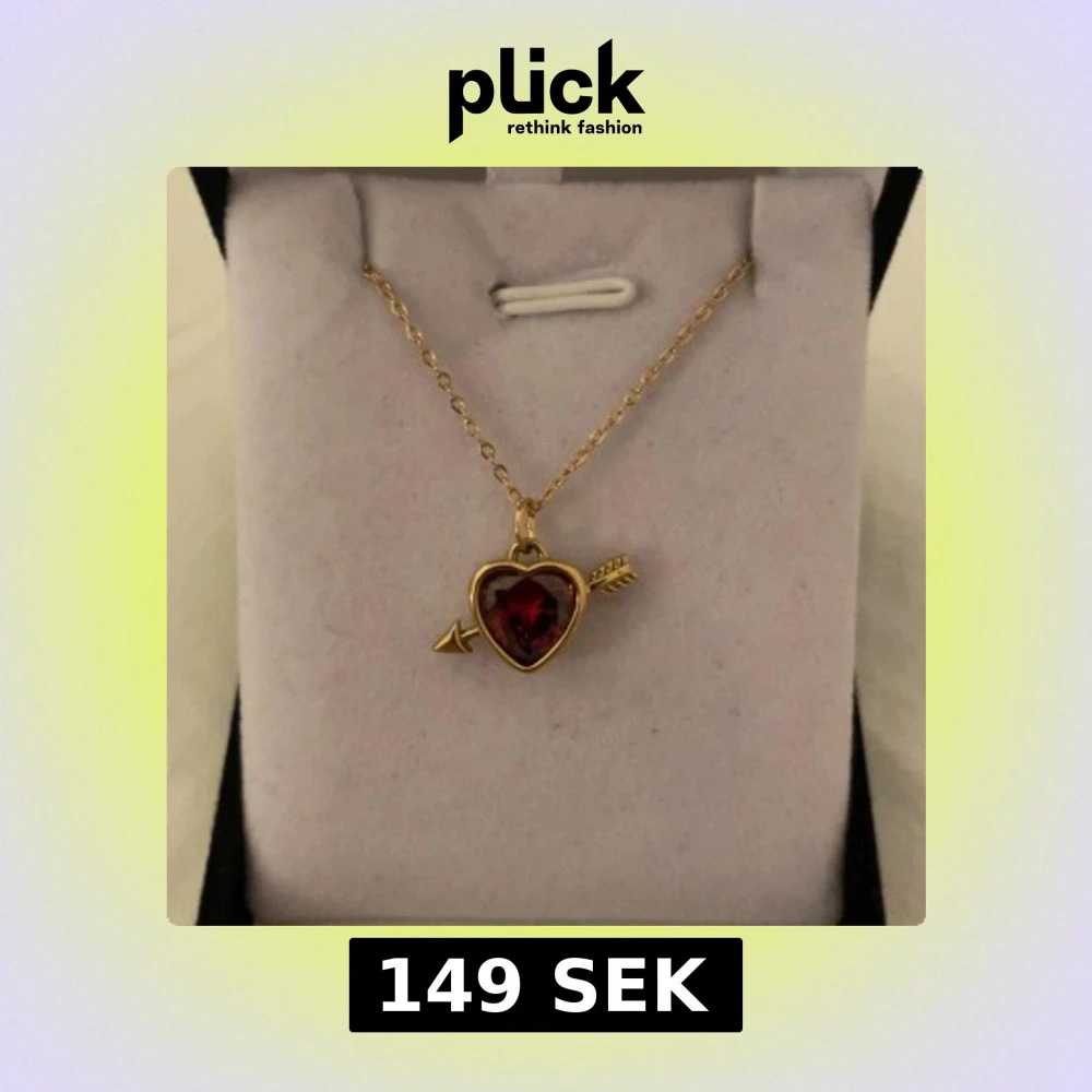 Superfint halsband i guldton med ett hjärtformat rött hänge och pil-detalj. Kedjan är tunn och elegant, och hänget har en gnistrande röd sten i mitten. Perfekt för dig som gillar romantiska smycken med lite extra attityd. Rostfri